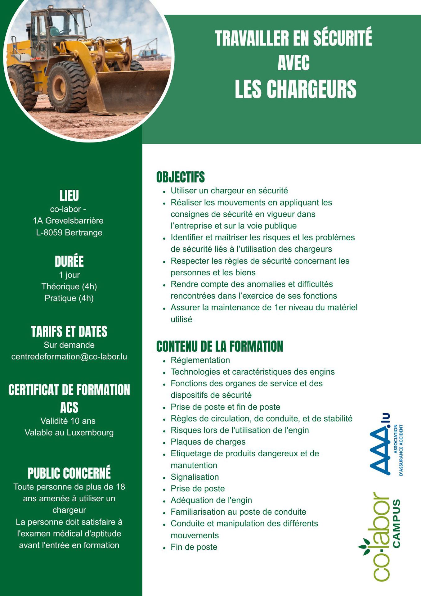 Être capable de conduire des pelles hydrauliques en respectant les règles de sécurité, suivant la recommandation de prévention établie par l'Association d'Assurance Accidents (AAA).